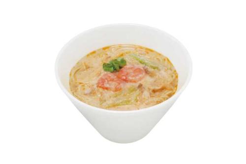台湾の「鹹豆漿」をイメージ。豆乳を増量し、えびやキャベツなど具沢山。ピリ辛ラー油がアクセントになっています。