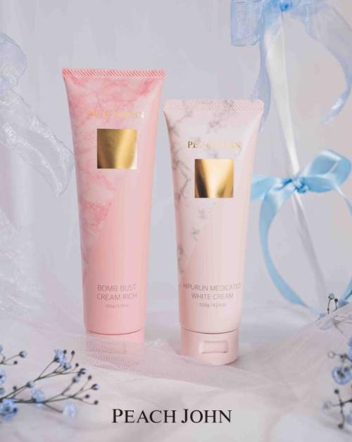 バスト用「ボムバストクリーム リッチ」は150g入りで3,278円。パール剤配合でトーンアップ効果があり、ピンクカプセルビタミンEや保湿成分がハリとうるおいをサポート。