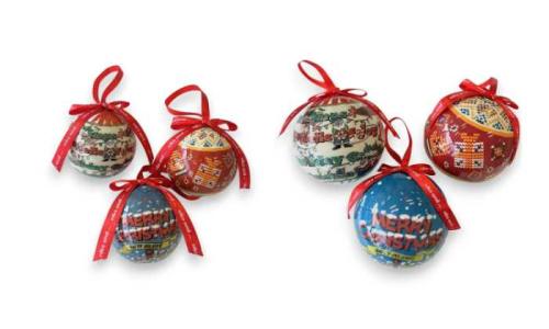 人気のキャンディボールオーナメント(495円/770円・6cm/8cm、プレゼント/サンタ/パーティー)は毎年デザインが変わる注目アイテム。