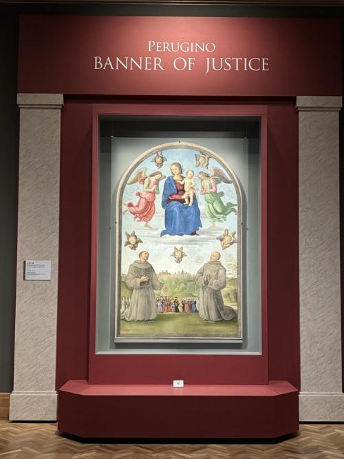 日本初公開!ペルージャのウンブリア国立美術館が所蔵する、ピエトロ・ヴァンヌッチ(通称ペルジーノ)の作品「正義の旗」(218×140cm)。イタリア国外での展示は初めてで、上下二段構成の作品には聖母子や天使の姿が描かれています。
