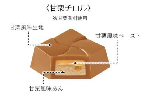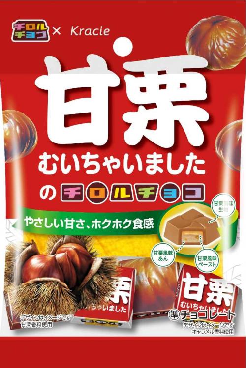 チロルチョコ〈甘栗むいちゃいました〉は、甘栗風味のチョコ生地の中にペーストとあんを閉じ込め、本格的な甘栗のやさしい甘みとほくほく食感を再現。