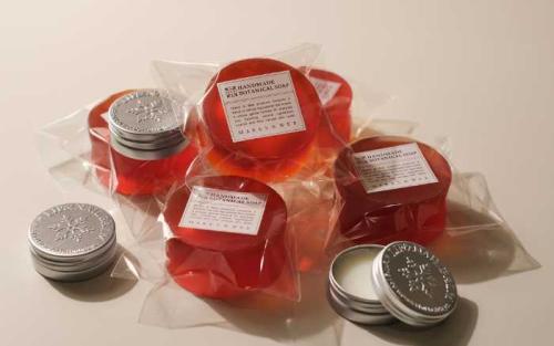 雪の結晶モチーフの保湿バームや鮮やかな赤色のソープなど、見た目にも華やか。