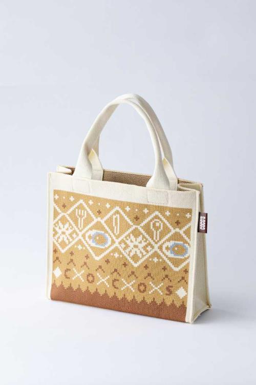 包み焼きハンバーグ柄のノルディック柄ニットバッグは、500mlペットボトルや折り畳み傘も収納可能。