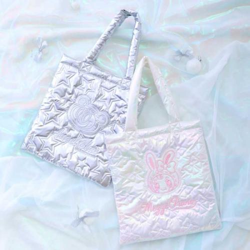 存在感たっぷりの「キラキラキルティングトートバッグ」(全2種・6,600円)は、ベリエちゃんはホワイトオーロラ×リボン柄、ナカムラくんはシルバー×星柄のデザイン。