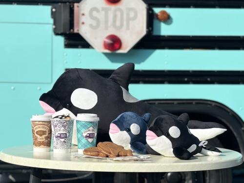 コーヒーメニューの種類も豊富で、カフェラテやハニーラテ、キャラメルラテなどもご用意。ソフトクリームにシャチクッキーがトッピングされた、オルカソフトチョコ&バニラや、オルカソフトいちご&バニラなども販売。
