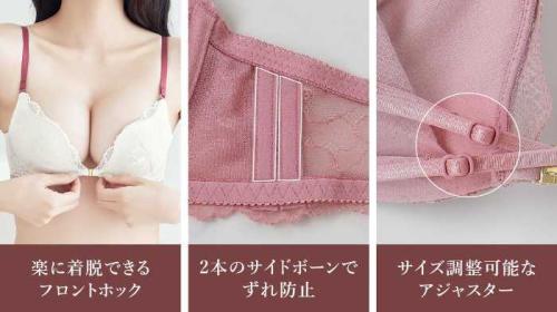 着脱もスムーズで、背中側のホックが苦手な方にもおすすめです。また、一般的には1本のサイドボーンが2本設計になっており、ズレにくく長時間のお出かけでも美しいバストラインをキープ。