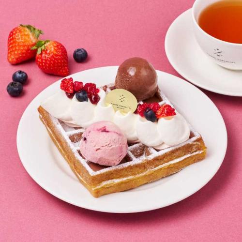 ワッフル好きには「ワッフルオフリュイルージュ&ショコラ(1,430円)」がぴったりで、苺のクリームや赤いフルーツがアクセントに。