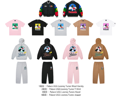 コラボレーションアパレルには、Palace UGG Looney Tunes Wool Varsity、T-Shirt、Hood、Joggerなどが登場。カラフルな色展開で、シューズと合わせたコーディネートも楽しめます。