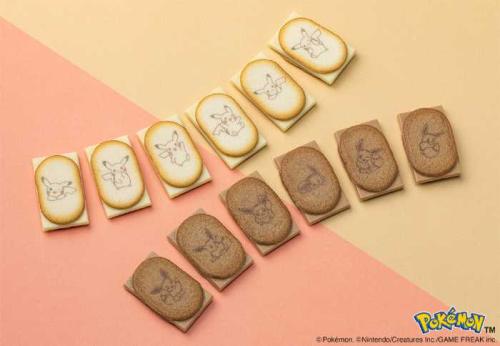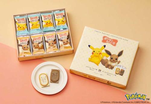 「ポケモン東京ばな奈 はみ出しチョコのクッキーサンド」は、バナナヨーグルト味(ピカチュウ柄)とキャラメルマキアート味(イーブイ柄)の2種が入った24枚入2,592円のセット。