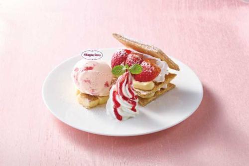 今年新登場の「ハーゲンダッツといちごのミルフィーユ」は、サクサクのパイ生地と冷たいストロベリーアイスが絶妙にマッチした新感覚スイーツ。価格は799円(税込879円)。