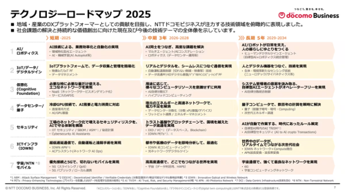NTTドコモビジネスは、少子高齢化や地域格差、環境問題、サイバーリスクといった現代の多様な課題に対し、「産業・地域DXのプラットフォーマー」として解を提示するため、本ロードマップを公表しました。公開日は2025年9月17日で、NTTグループのアセットをワンストップで提供する立場から、短期(~2025年)・中期(2026~2028年)・長期(2029~2034年)の3フェーズに分けて7つの技術領域の方向性を示しています。
