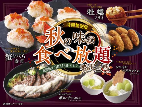 「ザ ブッフェ ニューマーケット イオンレイクタウン越谷」では、9月11日(木)から10月15日(水)までの期間限定で『秋の贅沢三昧コース』が提供されます。通常のブッフェ料理に加えて、秋の味覚を存分に楽しめる特別メニューがオーダー形式で登場し、時間無制限で堪能できるのが最大の魅力です。