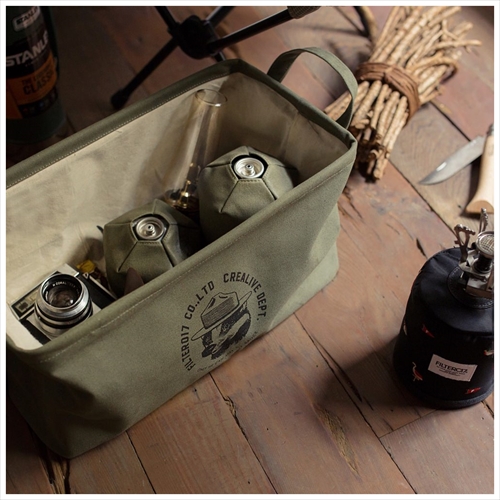 肉厚のある帆布素材とキャラクターのプリントにより、ミリタリーの収納アイテムを思わせる無骨な佇まいに。自宅では雑貨類、キャンプでは荷物の置き場として活躍しそう。