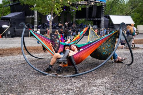 GO OUTステージ前新エリア「CHILL OUT エリア」は、アメリカ発のハンモックブランド「ENO(イーノ)」とのコラボレーションにより爆誕! 独特なスタンドに取り付けられたハンモックに揺られながら音楽を楽しめる、まさにチルなエリアです!