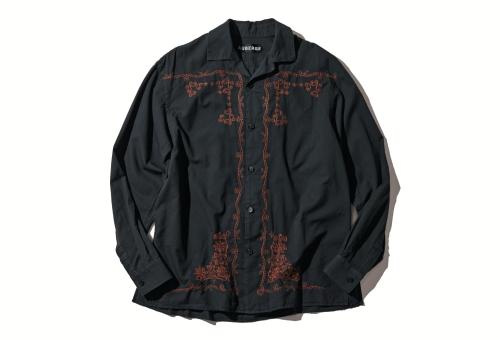 ロープとペイズリーが刺しゅうで入った、オーベルジュのシャツをカラー別注。「グリーン×オレンジの配色がこだわり。1枚でも着られるし、ジャケットから刺しゅうを覗かせるのもアリです」