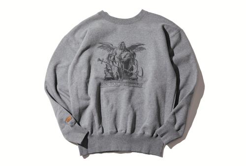 前面と背面に同サイズのプリントが入り、どちらを前にしても着用できる両A面スウェット。「表にはゼウス、背面にはデビルがプリントされているので、その日のキブンで使い分けできます」。