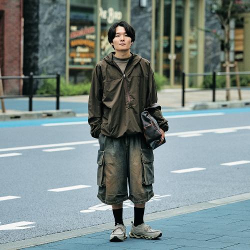 プラス エイティ ワンのディレクターで、オリジナルブランド、クレストのデザイナーとしても活躍。趣味は、サウナ、自転車、カメラなど。「ブラウンカラーを中心に、フェード感のあるアイテムを取り入れました」。オーガナイズドフーデッドプルオーバー¥44000/サンドウォーター グラデーションダイL/S シャツ¥27500、ヴィンテージダイハーフパンツ¥4620、 ヴィンテージレザーホリデーバッグ¥50600/以上すべてクレスト シューズ/ウェーブプロフェシーモック¥31900/ミズノ