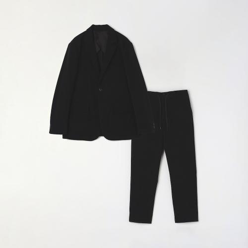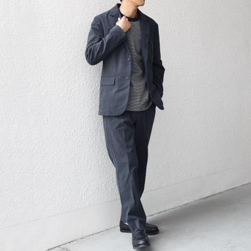 裏地を一部省くことで、軽やかな着心地とミニマルなデザインに仕上げたセットアップ。ジャケットのラペル幅をやや太めにすることで、程よくクラシックな印象に。