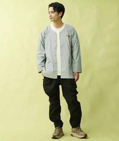 ワークテイストの無骨な印象でありながら、襟のないシャツによってスッキリとした印象の着こなしに。爽やかなストライプ柄を引き立てるため、インナーはモノトーンカラーをチョイス。