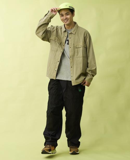 シャツは軽やかなナイロンボディで、パンツは多機能なポケットを搭載。フィールドで存在感を放つアイテムで揃えつつ、ともにゆったりとしたシルエットでストリートな印象に。