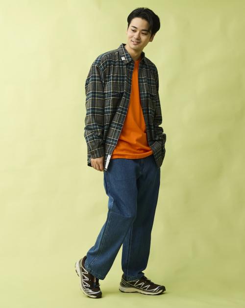 クラシックなフランネルシャツはオーバーサイズで、内側にビビッドなインナー、パンツにラフなイージーパンツをチョイス。シンプルなアメカジを今っぽく着こなしています。
