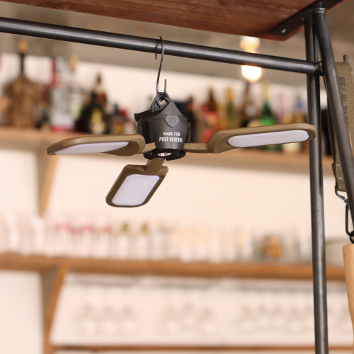 付属のシェードでランタンとして使え、細長いフォルムを手に持つとハンドライトに。隠しフックであらゆる場所に吊り下げられ、3つの点灯モードがクイックに切り替えられます。