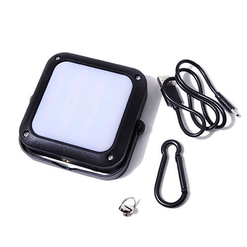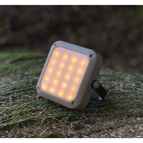 カラビナとDリングを併用して掛けたり吊るしたりでき、ハンドルアームでそのまま置いての使用も可能。モバイルバッテリーとしても利用できるのもキャンパーに嬉しいポイント。