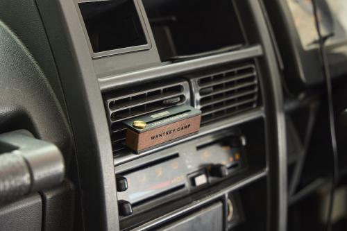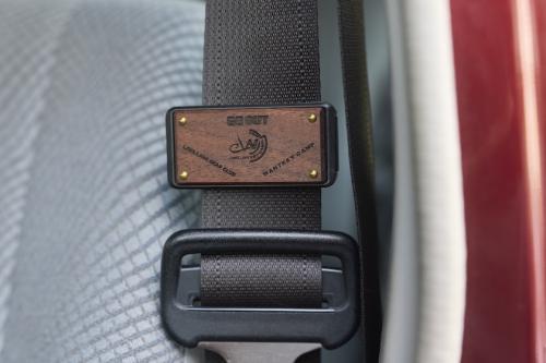 シートベルトの締め付けを緩和する、ドライバーには嬉しいあると便利なストッパー。ポイントはウォールナットの質感を引き立てるように施したロゴデザイン。荒々しいウッドの存在感を損なわないよう、バランス良く3者のアイコンが並べられています。