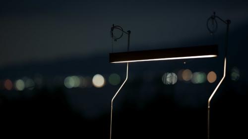 “LF1984”は、2本のワイヤーで吊り下げることができるバッテリー充電式のポータブルペンダントライト。本体から伸びる2本のワイヤーの先にはフックがあり、様々な場所に吊り下げ可能だ。