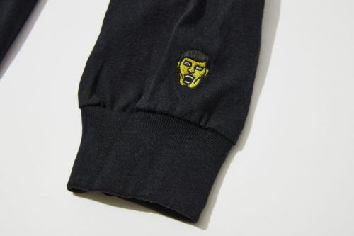 袖口の先端にはメインキャラ・アイツの刺繍を施し、背面に目を向けるとオリジナルのフォントでパンクドランカーズのロゴをプリント。さらに背面の裾にはワンポイントでピスネームもオン。ベースのモデルにはない、細かなディテールにもオリジナリティを注入しました。