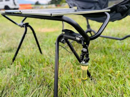「MFT」は、変形機構を備えた、ユニークな多機能テーブル。今のトレンドとなっている、25×36cmサイズのユニット式バーナーがセットできるほか、テーブルだけでなくギアハンガーとしても使える意欲的なアイテムです。