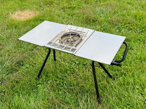 付属の天板にくわえ、スノーピークの定番ユニット式コンロ「フラットバーナー」を乗せるとこのようなセッティングに。
