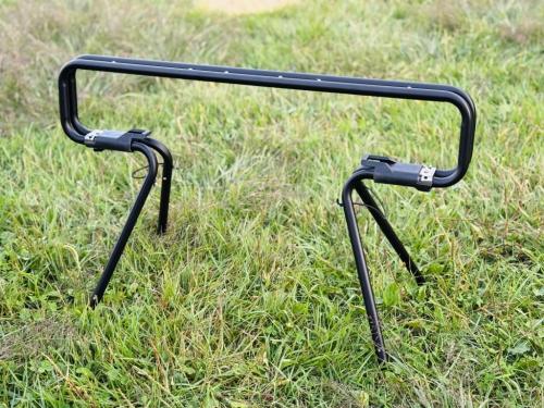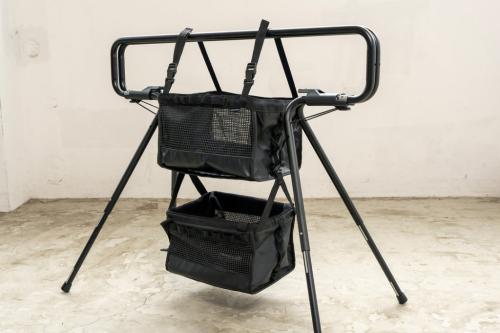 変形が完了するとこのような姿に。上部のバーに自前のカラビナやフックを使って物を吊るせば、ラックとして機能します。