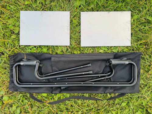 セット内容は、ブラックの塗装が施されたアルミ製のフレームにくわえ、スノーピークのIGTシリーズと同じ、25×36×10cmのステンレス天板が2枚付属。