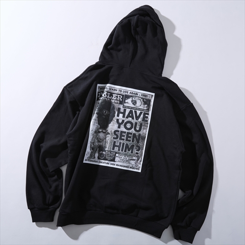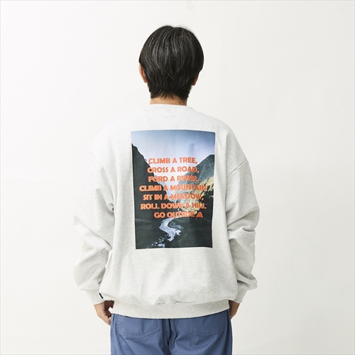 雑誌の切り抜きを思わせるバックのグラフィックは、モノトーンカラーでありながらも存在感たっぷり。ソフトな裏パイルボディを使い、程良くゆとりのあるシルエットに。