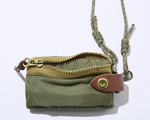 キルトステッチを施したタフな生地は、チャコ軍が80年代に採用したデッドストックのキルティングライナーパンツを解体したもの。ミリタリーウエア好き垂涎の洋服を使い、毎日のように使えるショルダーバッグとミニウォレットに再構築しています。