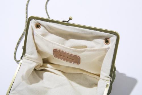 前回、別の生地で作られ即SOLD OUTしたがま口タイプのショルダーバッグ。パカっと大きくバッグ口が開くため、収納した荷物をスムーズに取り出せます。さらに小物用のポケットで小分けができるうえ、ロゴをエンボス加工した革製ピスネームも表地と同様に経年変化が楽しめます。
