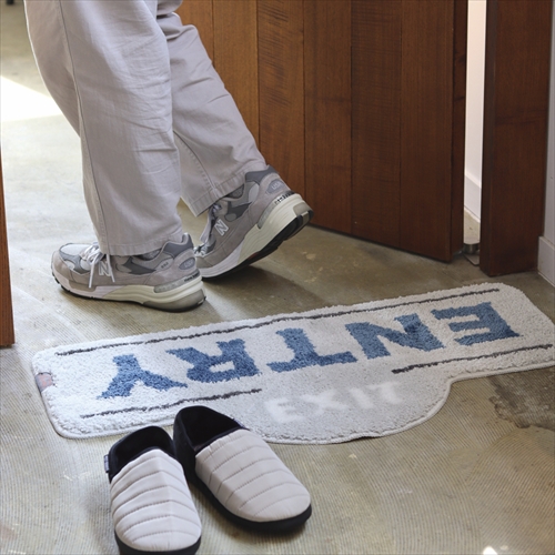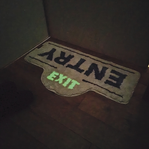 エントランスのアクセントになるマットは、“EXIT”の文字を蓄光糸でレタード。暗闇で光を放つことで、出入り口を示すようにデザインされた遊び心あふれる一品に。