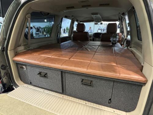 後ろから覗くとベッドになっているし、言う事なし! FLEXの「67 ROKU NANA ドロワーキット」にシート同色のレザー製ベッドマットで超フラットな空間に。収納力もあって寝心地バツグン(きっと)。これでキャンプや釣りに行ったらさぞ鼻高々で快適なことでしょう。