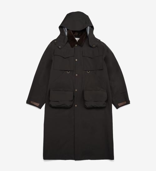 こちらも同じくGORE-TEX®︎のファブリックを使用したフィッシングコート。 フロントに「ウールリッチ」の名作“アークティックパーカ”を彷彿とさせるマチ付きフラップポケットを配置し、実用性とともに特徴的な表情を追加。 膝下丈のシルエットは、湖や管理釣り場での着用を想定して設計されています。
