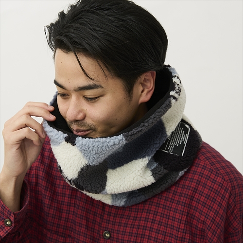 アイコン的キャラクターの顔と輪郭を象った、遊び心あふれる迷彩パターンをプラス。毛足の長いボアが保温性を高めるうえ、ダークトーンな冬スタイルに彩りを与えてくれます。