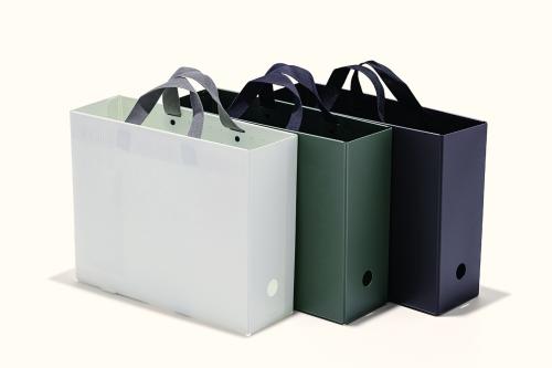 ファイルケースに取っ手が付いたデザインで、PCや書類などの仕事道具や細々した生活用品などを家庭内やオフィスで気軽に持ち運びができるのが便利な新製品。高さが約半分のハーフサイズもある。各¥1210