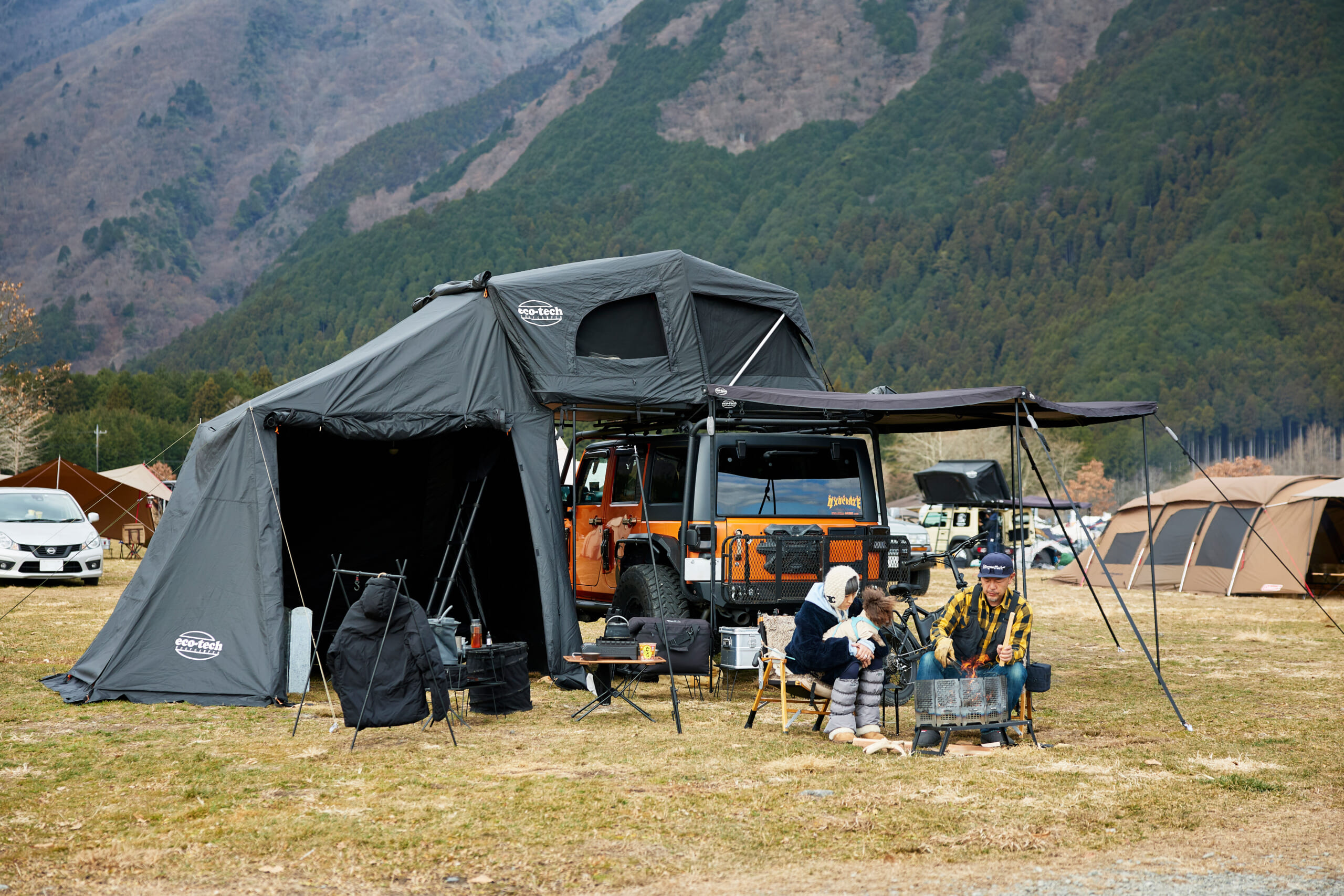 愛車のJEEPにエコテックのルーフトップテントとオーニングを搭載したこのサイト。どちらも選んだメーカーはエコテックで、3〜4名が入ることのできるTXをチョイス。ルーフトップテントなら手軽にサイトを作ることができるので、寒い中で設営に時間をかけずに済むのもメリット!