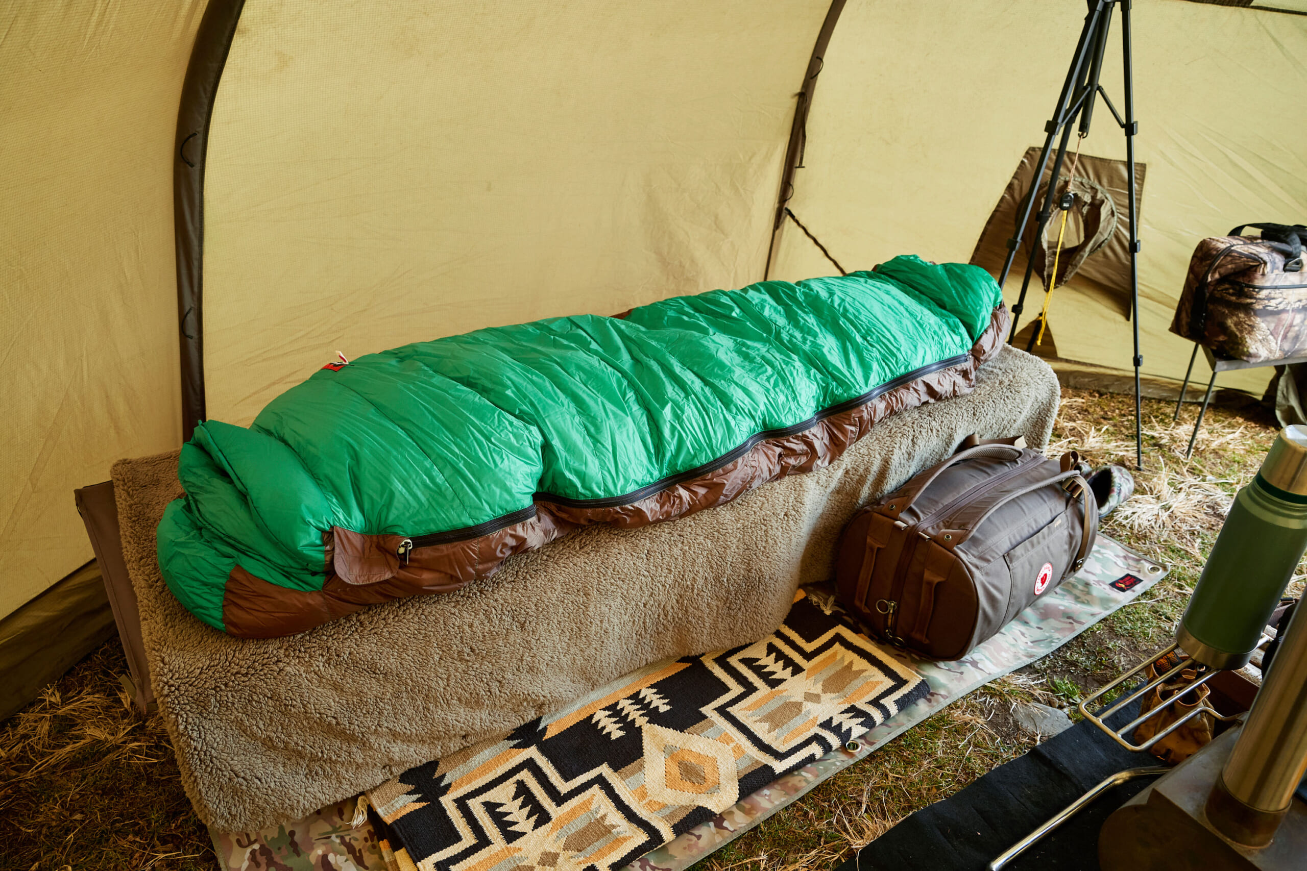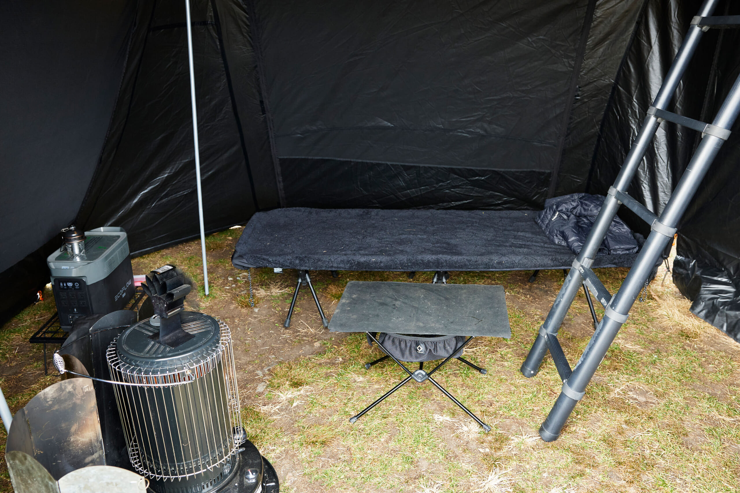 室内中央にストーブを設置し、左右にはコットを配置。フロアレスのため、コットの下にはオレゴニアンキャンパーのシートとラグで地面からの冷気をシャットアウト。手前にリビングを置くスペースも確保され、基本はここで過ごすそう。コンパクトにサイトを展開すれば、移動回数も少なく済む。
