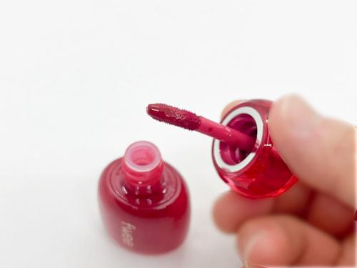 唇に乗せると、驚くほどの透明感。元々の唇の色に重なることで程よい赤色になり、みずみずしく血色の良い唇を演出してくれます。