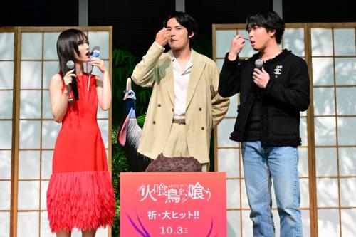 主人公である久喜雄司(水上)の妻・夕里子役の山下は、完成披露試写会後の反響について「SNSにコメントを書いてくれる方も多くて、特に宮舘さんのファンの方がコメントの語尾にバラの絵文字を付けてくれる。“『火喰鳥を、喰う』怖かった(バラ)”とか。怖いのか怖くないのかよくわからない」と笑うと、宮舘は「僕のファンの方は最後にバラを付ける。だから自然に咲いちゃいますよね、バラが」と舘様節で笑わせた。