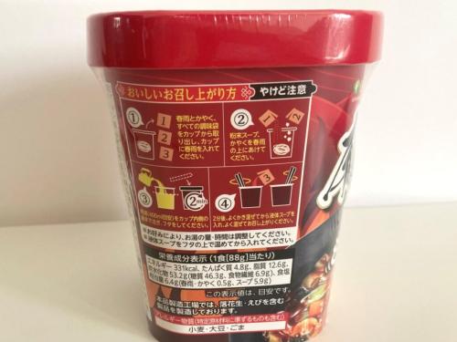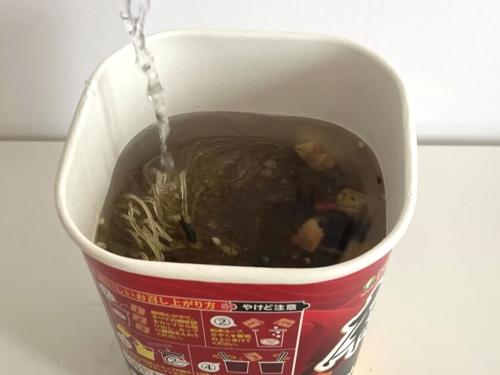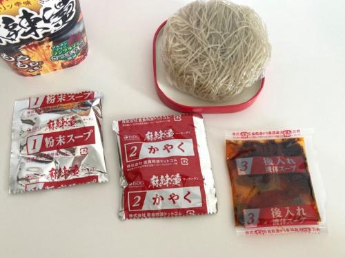 カップの側面に作り方が書いてあるので、表示に従って作っていきます。中に入っているのは、春雨・粉末スープ・かやく・後入れ液体スープの4つ。
