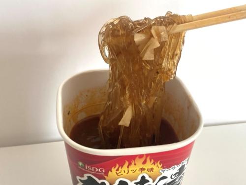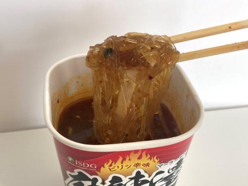 すでにガチ中華としか言いようのない香りを感じながら一口食べてみると、もちもちの春雨に奥深い風味のスープがよく絡んでいて、とても美味しい!想像以上に華やかで、スパイスの効きまくった味わいに感激です。口の中がビリビリしますが、ヒー!となるような辛さは思ったよりも控えめです。私は、唐辛子のヒリヒリとするような辛さは苦手なのですが、花椒などのシビレ系の辛さは好きなので、これはもう最高です。