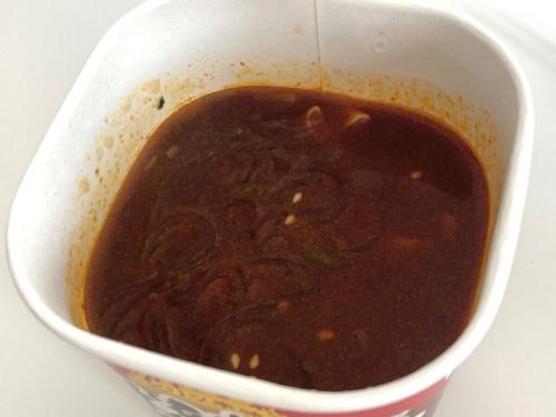 2分後、フタを開けます。しっかりと水分を吸って膨らんだ春雨とかやくの湯葉が美味しそう。少しかき混ぜたあと、後入れ液体スープを入れ、もう一度よくかきまぜて、完成!しっかり赤くて辛そう~。
