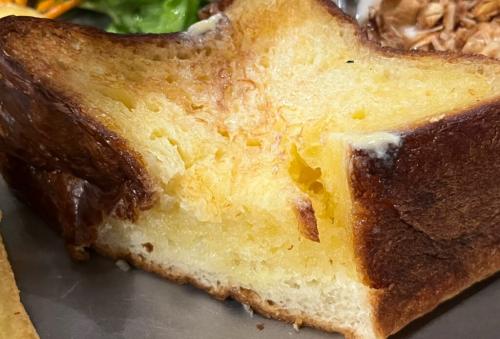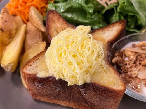糸のように盛り付けられたバターが目を引きます。届いた瞬間からトーストの熱で溶けていき、ムーにしみ込んでいって美味しそう!